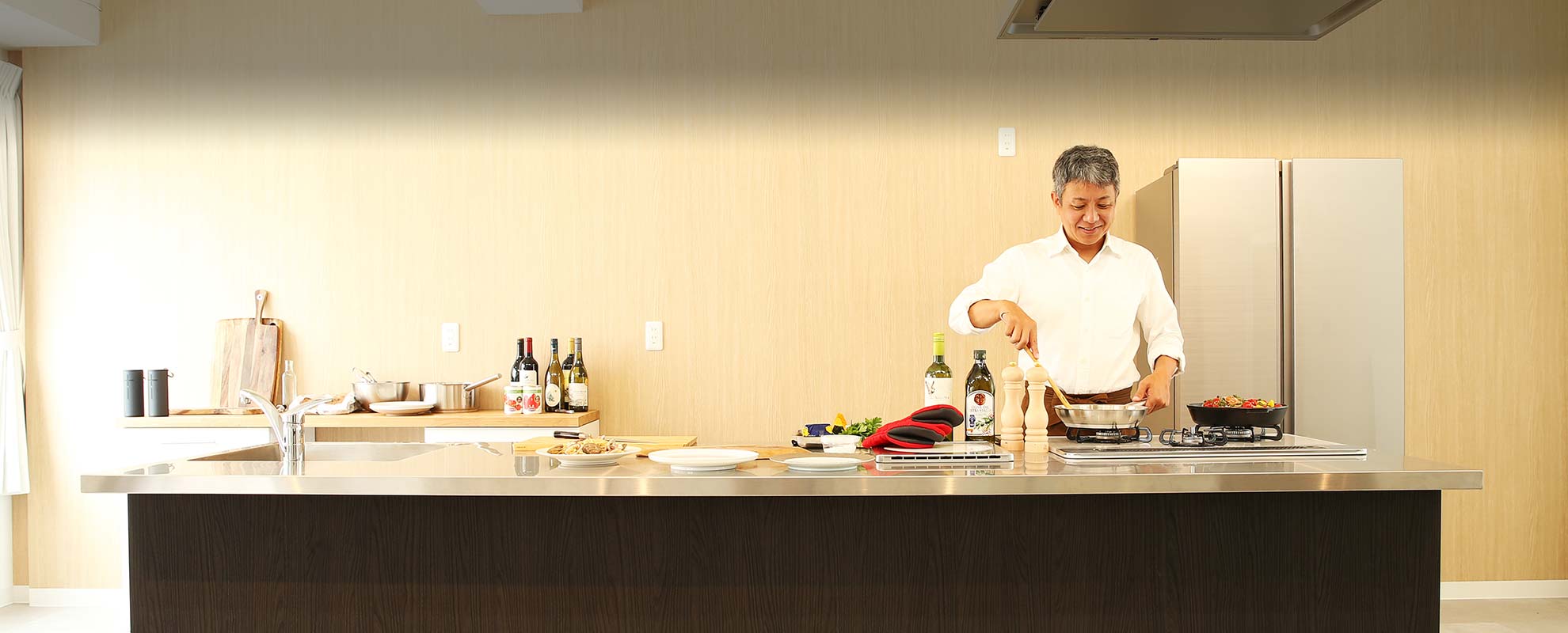 「スタジオ A」には大きなアイランドキッチンと大容量のおしゃれな冷蔵庫を完備。